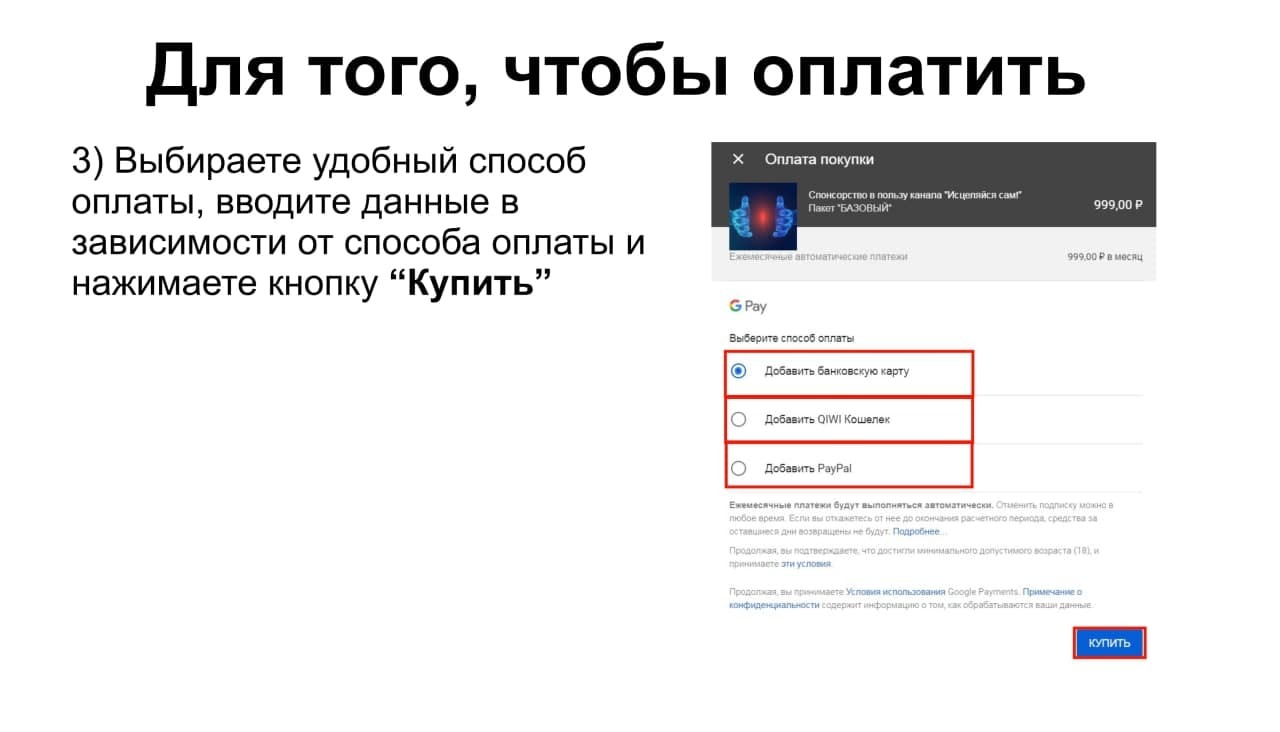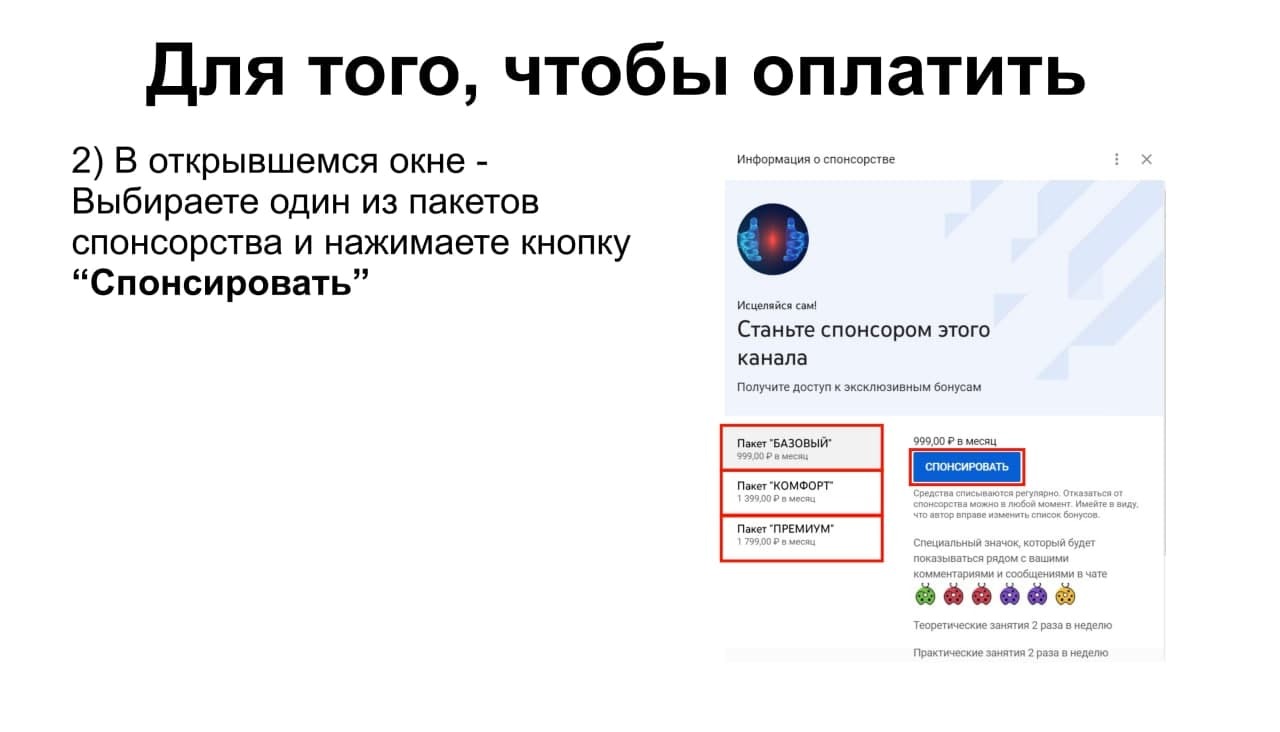 После того, как вы нажмете на кнопку и перейдете на ютуб-канал, вам откроется страница с выбором спонсорского пакета.